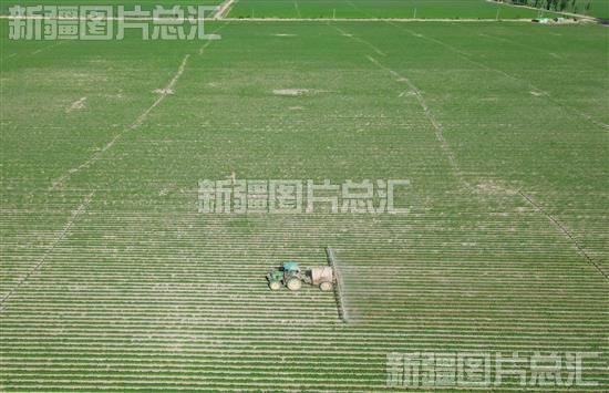 5月30日,在精河县大河沿子镇呼和哈夏北村棉花地里,农民驾驶植保机来回穿梭作业喷洒药物。