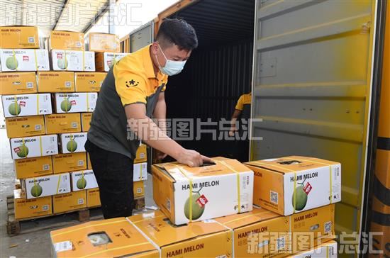 5月30日,在新疆吐鲁番市鄯善县地产仓,工人将装箱的哈密瓜装入冷链物流车。