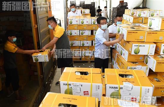 5月30日,在新疆吐鲁番市鄯善县地产仓,工人将装箱的哈密瓜装入冷链物流车。