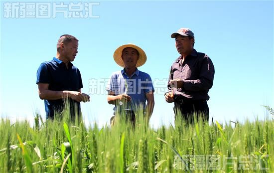 2022年6月7日,裕民县交通管理局驻该县新地乡新地南村“访惠聚”工作队队员与村民一起查看冬小麦生长情况。