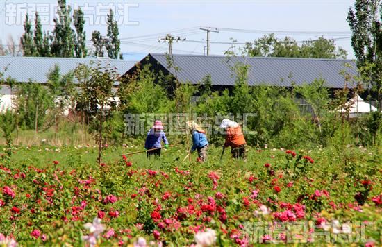 2022年6月7日,裕民县江格斯乡江格斯村村民在生态采摘园花田间除草。
