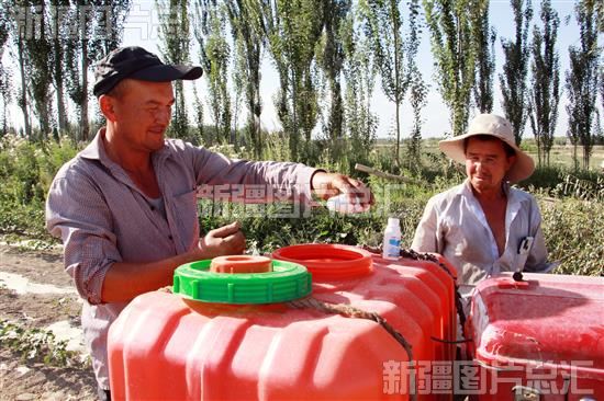 2022年6月7日,棉农在阿瓦提县塔木托格拉克镇塔木托格拉克村棉花地里添加农药,进行喷洒作业,防治病虫害。