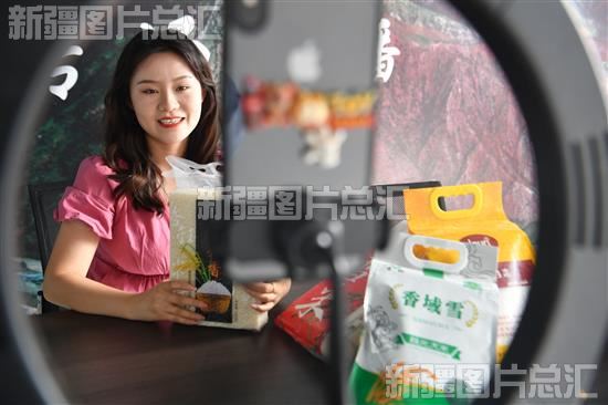 2022年6月9日,创业青年乔慧敏在温宿县双创电商产业中心直播销售温宿大米。