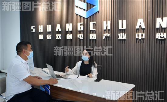 2022年6月9日,工作人员和企业负责人在温宿县双创电商产业中心洽谈合作。