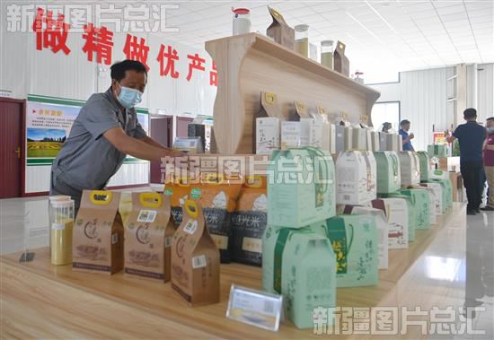 2022年6月9日,新疆昆托米业股份有限公司员工在展厅摆放各类米产品。