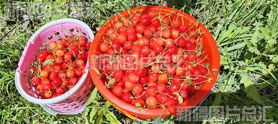 2022年6月6日,察布查尔锡伯自治县海努克镇向阳村采摘园采摘的樱桃准备上市。