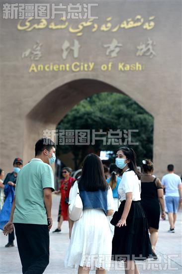 在喀什古城东门口,游客享受着慢节奏的老城时光(2022年6月11日摄)。