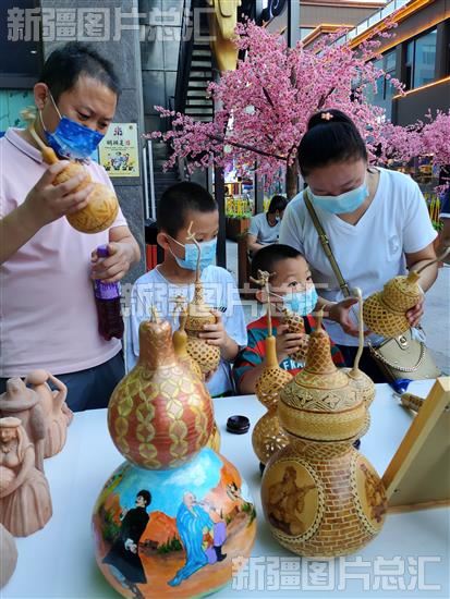 2022年6月11日,市民在新疆吐鲁番市高昌区西游文化旅游步行街活动现场参观葫芦画。