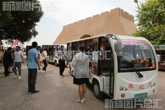 2022年6月13日,游客在喀什古城景区准备乘坐观光车参观。