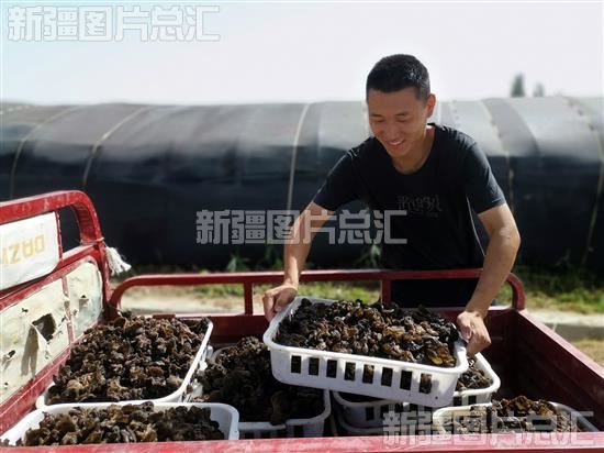 2022年6月18日,农户在阿瓦提县巴格托格拉克乡墩买里村黑木耳种植基地搬运黑木耳。