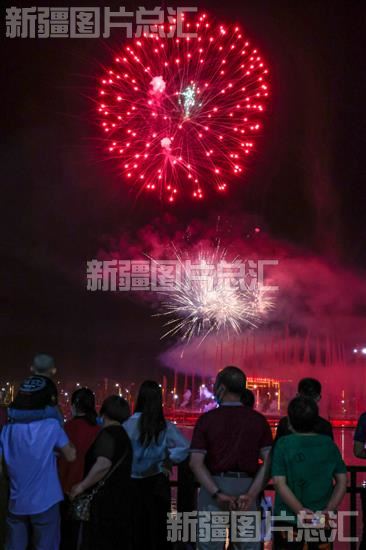 2022年6月15日,市民在库车市东湖文化广场观看烟花表演。