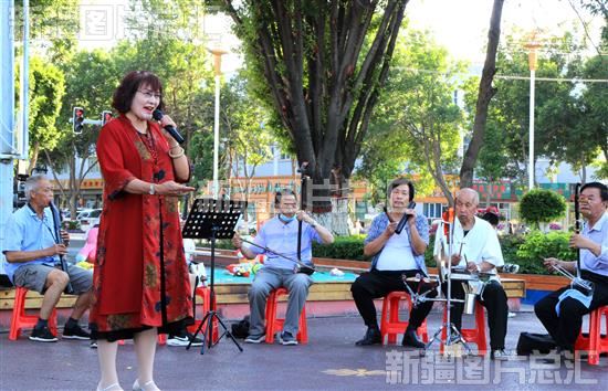 2022年6月19日,在裕民县人民公园广场上,豫剧爱好者在为观众表演豫剧。