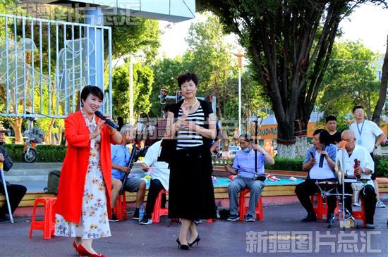 2022年6月19日,在裕民县人民公园广场上,豫剧爱好者在为观众表演豫剧。