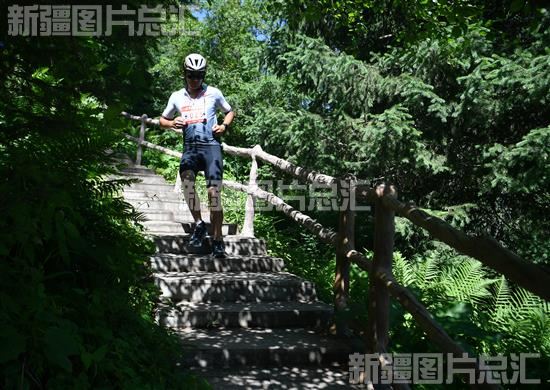 2022年6月18日,参赛选手在新源县那拉提旅游风景区山中步道上前行。