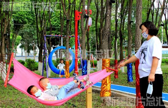 2022年7月4日,居民在裕民县城街头新建成的秋千公园里游玩。