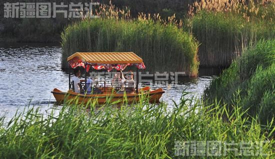 2022年7月4日,游客在穆孜鲁克湿地公园乘船观光。