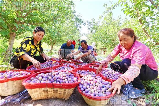 2022年8月26日,库车市玉奇吾斯塘乡代尔瓦扎亚村村民在新梅种植基地分拣新梅。