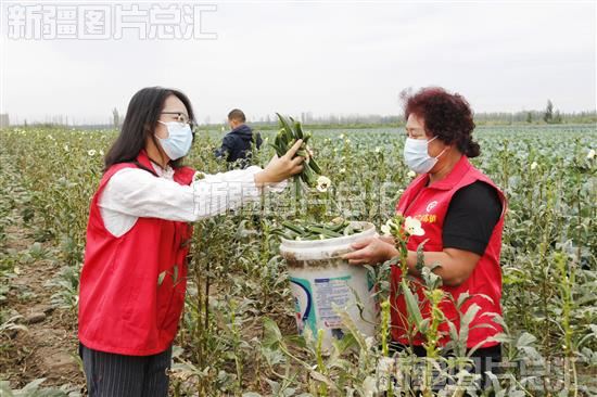 2022年8月26日,沙湾市市场监督管理局驻乌兰乌苏镇头浮新村“访惠聚”工作队队员帮助村民采收秋葵。