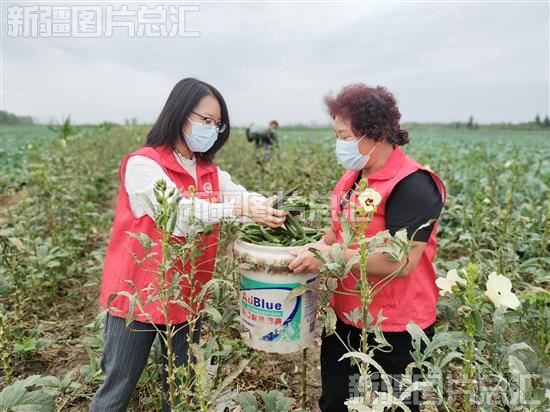 2022年8月26日,沙湾市市场监督管理局驻乌兰乌苏镇头浮新村“访惠聚”工作队队员帮助村民采收秋葵。
