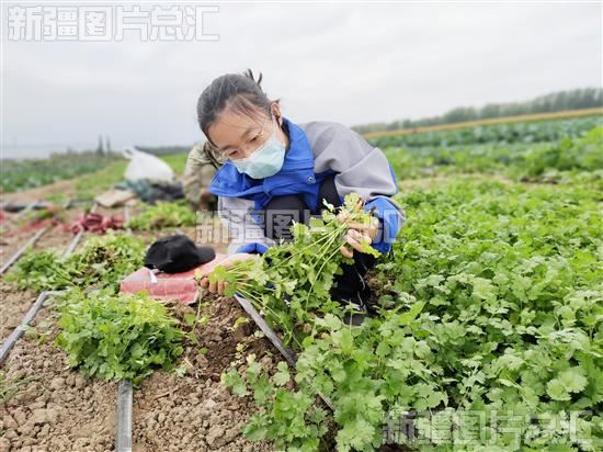 2022年8月26日,沙湾市乌兰乌苏镇头浮新村村民正在采收香菜。