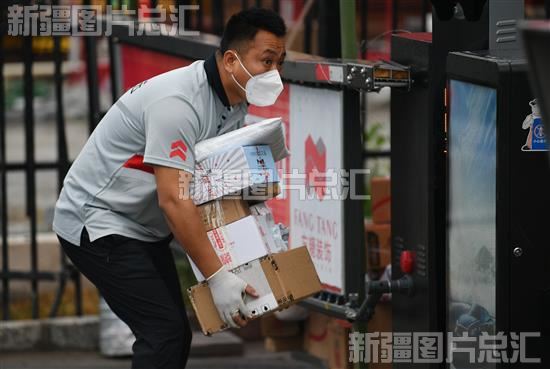 2022年9月12日,同城快递工作人员在乌鲁木齐市高新区(新市区)四平路一处小区卸载快递。