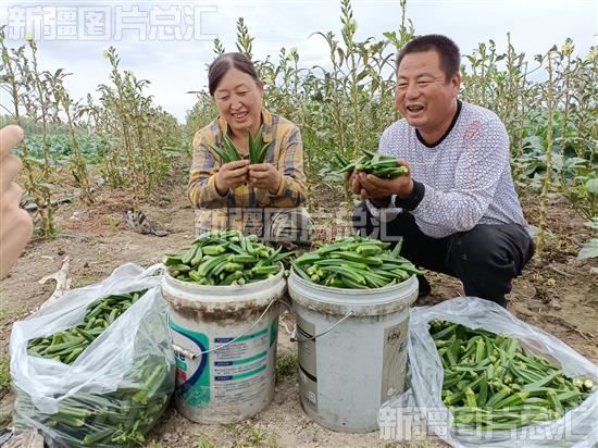 2022年9月20日,乌兰乌苏镇头浮新村村民金玉龙夫妇展示采收的秋葵。