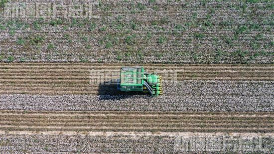 眼下,精河县种植的95万亩棉花已全面盛开,进入采摘期,采棉机在棉田中来回穿梭,采收棉花。