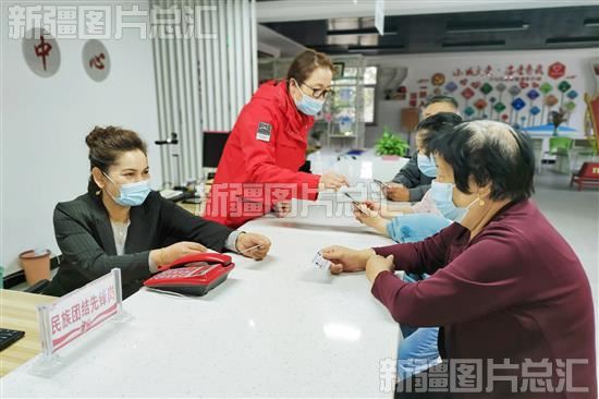 2022年10月2日,沙湾市委老干部局驻三道河子镇林场社区工作队队员和社区干部为居民办理医保缴费业务。兰玲摄