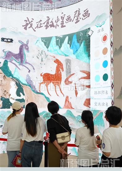 2022年10月1日,观众在“奋进新时代”主题成就展甘肃单元通过“我在敦煌画壁画”互动装置,感受敦煌壁画的魅力。