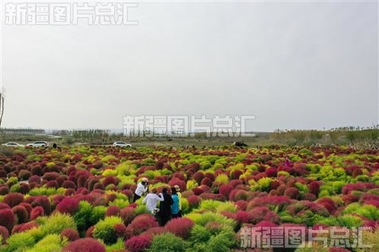 2022年10月3日,市民和游客在博乐市五一水库地肤草基地游玩。