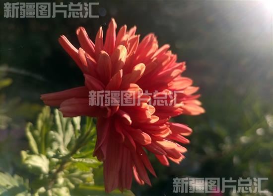 2022年10月8日,沙湾市桃园小区,当阳光洒在菊花上时,花瓣像是镀上了一层金。