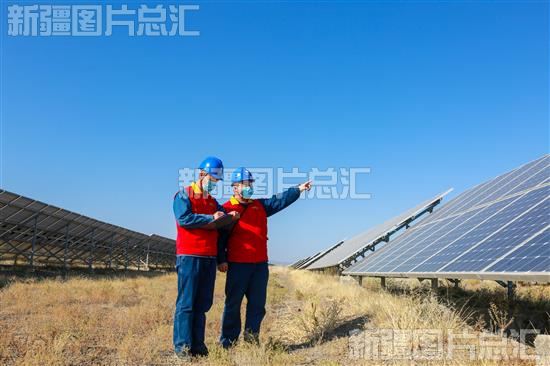 2022年10月11日,在博乐市九州方圆光伏电站,国网博尔塔拉供电公司输电运检中心工作人员在现场监测。