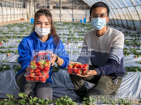 2020年12月22日,位于洛浦县杭桂镇托万皮切克其村的洛浦县精品特色果蔬种植园温室大棚里,村民采摘草莓。图片由和田地委宣传部提供