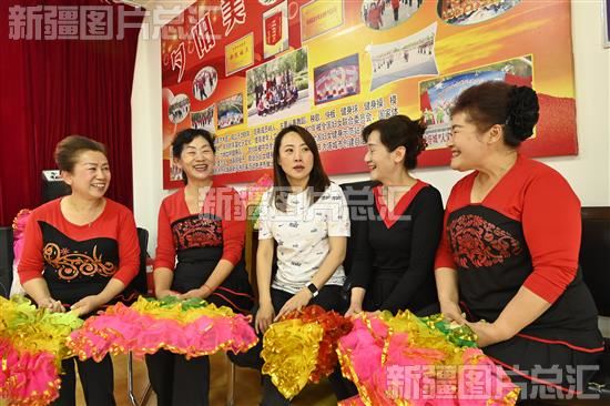 2022年9月22日,辽宁省沈阳市援疆工作队队员李兢兢(中)在塔城市杜别克社区与“夕阳美艺术团”舞蹈爱好者开心聊天。