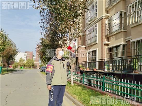 2022年10月10日,沙湾市三道河子镇老沙湾路社区党员志愿者分楼栋用喇叭通知居民核酸采样。