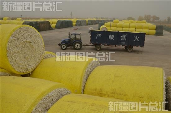 拖拉机拉运棉包交售到新疆生产建设兵团第一师二团棉花加工厂(2014年10月30日摄)。