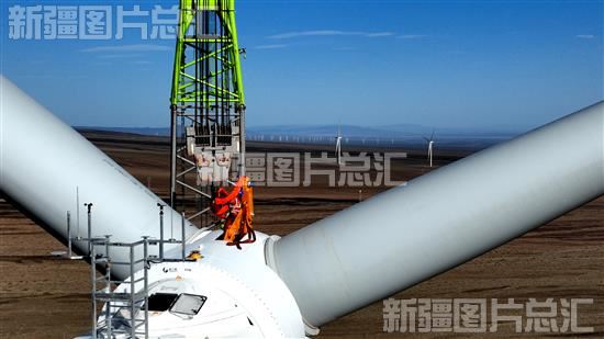 2022年5月24日,五家渠海天达风力发电有限公司员工在新疆生产建设兵团第六师北塔山牧场安装风力发电机组。图片由兵团党委宣传部提供