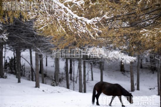 2022年10月1日,风雪中马儿在松林中觅食。