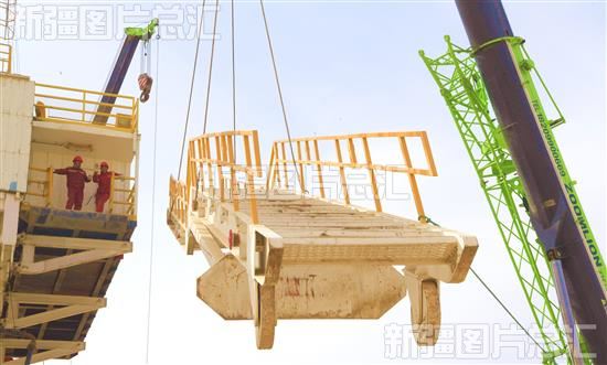 2022年10月17日,在新疆克拉玛依金龙2井区JLHW250井场,准东钻井公司70043钻井队,石油工人在吊装上钻井平台的旋梯。