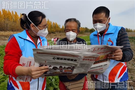 2022年10月17日,克拉玛依市古海街道九公里社区工作人员和农户一起阅读党的二十大开幕消息。