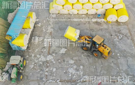 2022年10月22日,尉犁县众望纺织有限公司员工驾驶叉车转运新棉(无人机拍摄)。