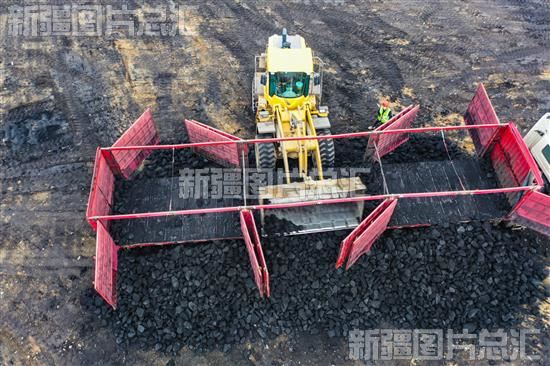 2022年10月24日,满载煤炭的卡车在呼图壁县雀尔沟镇煤场卸煤(无人机拍摄)。