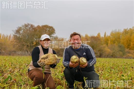 2022年10月23日,在博乐市阿热勒托海牧场阿热勒托哈村的甜菜地里,农户在展示丰收的甜菜。