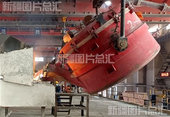 2022年10月12日,位于准东经济技术开发区的新疆神火煤电有限公司,工作人员正在倾倒铝液。