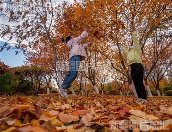 2022年10月22日,克拉玛依新行政区广场,一对母女踏着秋叶赏秋景。