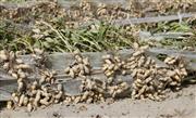 2022年?10月9日,大型机械在尉犁县兴平镇达西村的一块高标准农田采收花生(无人机拍摄)。