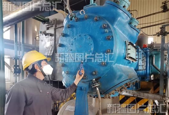 2022年11月3日,伊犁新天煤化工有限责任公司职工在车间检查压缩机振动值,确保装置平稳运行。杨运宽 摄