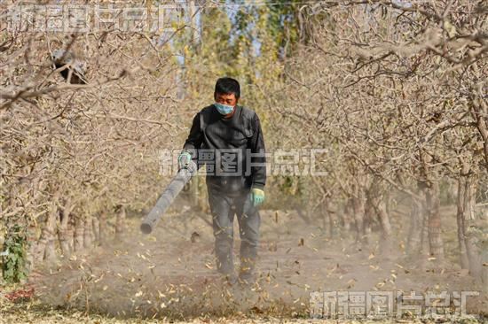2022年11月1日,若羌县吾塔木乡尤勒滚艾日克村枣农在用吹风机将红枣上的树叶吹开。