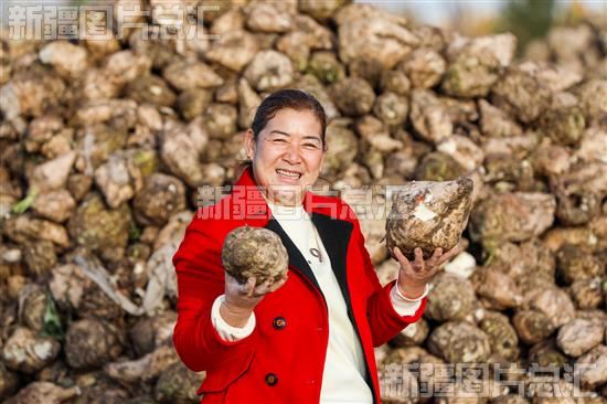 2022年10月29日,呼图壁县园户村镇北园社区甜菜地里,种植户展示丰收的甜菜。