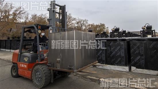 2022年10月31日,克拉玛依跬步电气科技有限责任公司员工驾驶叉车运输地埋分类式垃圾箱的半成品。